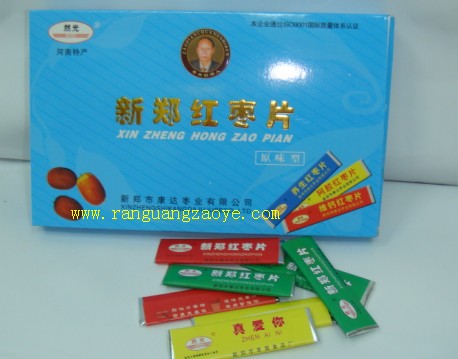 新郑红枣片采用先进工艺和科学配方生产,口味纯正、甘甜可口、营养丰富,老少皆宜,具有双吃两用“胜似口香糖,可口又环保;速溶变枣汁,早茶兼夜宵”的特点.