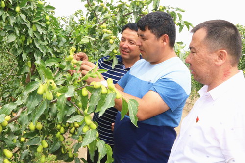 天山网讯(通讯员尼亚孜 · 热合曼摄影报道)8月26日,库车县齐满镇农技人员在检查吐库斯吐木村5组的红枣质量、长势。齐满镇今年红枣种植面积1.53万亩,近期以来齐满镇120余名农技人员对各村种植的红枣进行检查,结果表明今年红枣果实饱满,长势良好,有望实现大丰收。