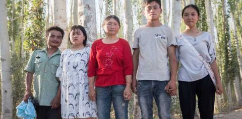 罗小川(右二)和哥哥(左一)、妹妹(左二)、妈妈(左三)、女朋友(右一)合影。