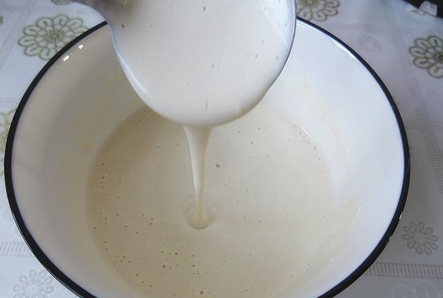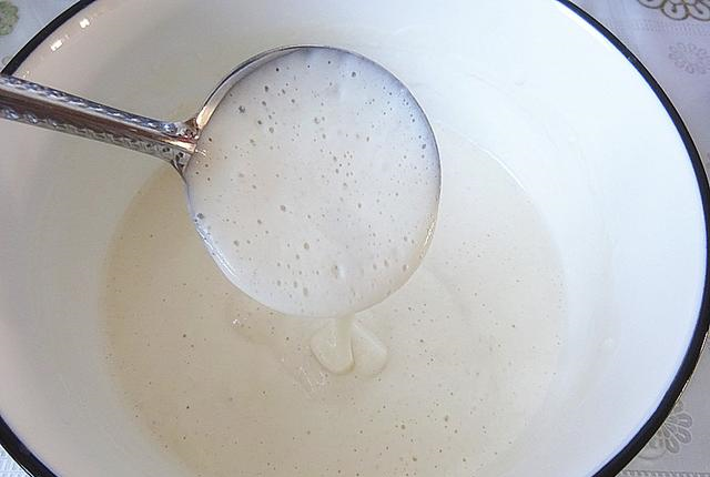 5、面糊发好,舀起来看看,里面都是气泡的样子,简单搅动几下,排排气。