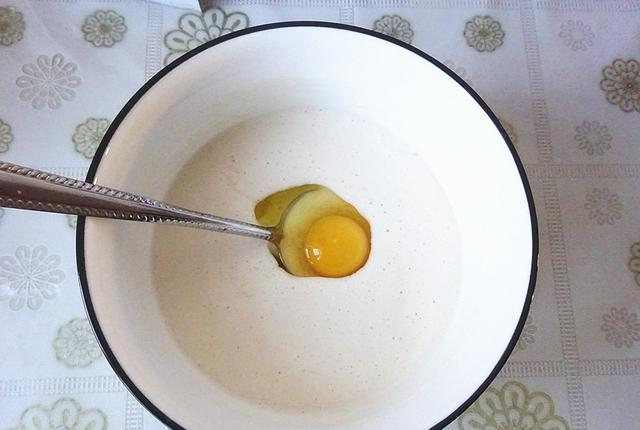 6、接着向发好的面糊里打入一个鸡蛋。搅拌均匀!