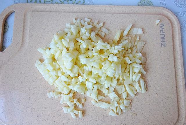 3、苹果去皮去核,切碎一点的小颗粒,我用了一个中等大小的苹果。