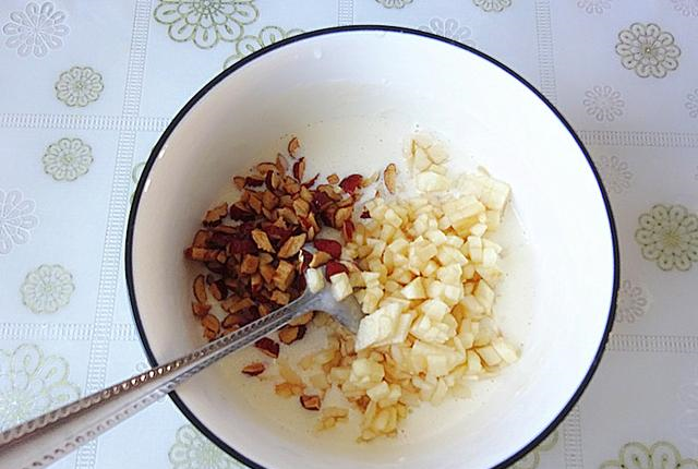 8、简单几下就搅拌均匀,苹果受热会更软一点,所以,块大一点也没事的,红枣相对有点硬,切碎一点。