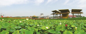 在风情园建设中,将杂草、树木丛生的荒草滩,改造成了令人驻足的荷香园。园内种植食用莲藕、栽植观赏荷花,各色籽莲和观赏莲共10多个品种1万余株。