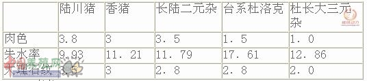 经测定评出:陆川猪肉色鲜红,为3.8级,长陆二元杂肉色较红,为3.5级,香猪肉色微红,为3级,台系杜洛克肉色微红为1.5级,杜长大三元杂肉色浅色红,为1.0级。www.powerpigs.net陆川猪、长陆、香猪的肉色分别为3.8、3.5和3.0,明显高于台系杜洛克1.5和杜长大三元杂1.0,说明陆川猪和长陆二元杂在肉色这一性状表现极为优秀,而台系杜洛克和杜长大三元杂分别是1.5和1.0,很明显,这结果低于正常范围。且肌肉近似灰白色,肌肉疏松失去弹性,新鲜肌肉的显面较正常肉湿润、松软。接近PSE猪肉的症状。在肉色持久性观察中得到:陆川猪在屠宰后两个小时仍能保持鲜红色,而香猪、长陆二元杂则已开始变灰红色,颜色发生了微妙的变化,台系杜洛克和杜长大三元杂分别在30、40分钟后开始变色,颜色变浅。陆川猪纯种较瘦肉型品种在肉色方面表现出极为优秀。