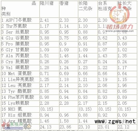 从测定结果上看,陆川猪、香猪不论是在氨基酸总成或必须氨基酸的含量上都较台系杜洛克、杜长大三元杂有较明显的差异,这正说明本地猪肉的营养价值高和肉香味的来源。本文来自猪场动力网。在试验结束时,我们还邀请了8位畜牧高级专家及20多位学生进行品偿试验,结果相当一致,都一致评定地方猪的肉质优于外来品种。