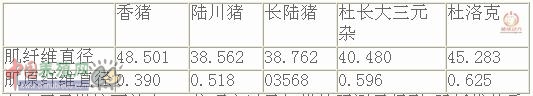 从以上结果看出,陆川猪不论是肌纤维还是肌原纤维都比长陆、杜长大、杜洛克要细,这完全可以证实陆川猪肉质的细嫩度。值得探讨的是香猪,香猪的肌原纤维最细,而肌纤维最粗,这是否可说明真正影响肉质细嫩度的是肌原纤维而不是肌纤维。