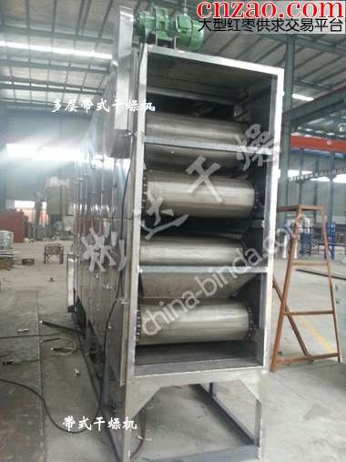 辣椒干燥生产线,彬达干燥设计的辣椒干燥机可采用整条辣椒进行烘干,使用脱水蔬菜带式干燥机进行串联,低温进行烘干,保证辣椒品质!低成本运行,收益高! 一、辣椒干燥生产线概述:DW系列带式干燥机将所要处理的物料通过适当的辅料机构,如星型布料器、摆动带、粉碎机或造粒机,分布在输送带上,输送带通过一个或几个加热单元组成的通道,每个加热单元均配有空气加热和循环系统,每一个通道有一个或几个排湿系统,在输送带通过时,热空气从上往下或从下往上通过输送带上的物料,从而使物料能均匀干燥。 二、辣椒干燥生产线特点:1、可以调节空气量、加热温度、物料停留时间及加热速度以取得最佳的干燥效果;2、设备配置灵活,可使用网带冲洗系统及物料冷却系统;3、大部分空气循环利用,高度节省能源;4、独特的分风装置 ,使热风分布更加均匀,确保产品品质的一致性;5、热源可采用蒸汽、导热油、电或燃煤(油)热风炉配套; 三、辣椒带式干燥机用途:DW系列带式干燥机是成批生产用的连续式干燥设备,用于透气性较好的片状、条状、颗粒状物料的干燥,对于脱水蔬菜、中药饮片等含水率高、而物料温度不允许高的物料尤为适合;该系列干燥机具有干燥速度快、蒸发强度高、产品质量好的优点。对脱水滤饼类的膏状物料,需经造粒或制成棒状后亦可干燥。对于脱水蔬菜,一般使用带式干燥机串联使用,形成初干段、中间段及终干段。在初干段中,由于物料含水量高,透气性差,故采用薄的铺料厚度,较快的运行速度及较高的干燥温度。如对物料温度不允许超过60℃的物料,初干段中,干燥气体温度可高过120℃以下;终干段内物料停留时间是初干段的3-6倍,铺料厚度是初干段的2-4倍,对于物料温度不超过60℃的要求,可采用80℃的左右的干燥气体。采用多段组合带式干燥机,可更好地发挥带式的干燥性能,使干燥更加均匀。 四、带式干燥设备选型及主要技术参数:根据上述物料干燥要求,结合“辣椒”低温干燥的特点,特别是整果所需干燥时间长等特点,选用DW2×14型五层带式干燥机进行连续式干燥作业。 五.辣椒物料设计参数1、 物料名称:辣椒;2、 处理量:50T/24h(成品量);3、 含水率:初水分为50%-60%,终水分为18-20%;4、 每小时水分蒸发量:1000-1300kg/h 六.辣椒干燥方案根据以上参数和我们的经验,选用我厂的DW2×12型五层型带式干燥机进行干燥(按每平方米网带蒸发3-4kg水计,需要360平方米),需三条生产线。 更加详细的技术方案,敬请咨询我公司技术人员! 七,辣椒带式干燥三条线设备能耗及尺寸1、装机总功率:140KW;2、耗煤量:350kg/h;3、干燥段有效长度:180m;宽度:2m;4、热风温度:80℃~125℃;5、干燥时间:4~5小时;6、料层厚度:10~60㎜;7、网带运行速度:0.15~0.2m/分钟,变频调速;8、外形尺寸(长×宽×高):55×8×5m; 八、脱水蔬菜带式干燥机设备主要配置(技术)特性:1、 根据“辣椒”干燥过程的脱水特性,采用预干、缓苏,再干燥的工艺,辣椒再冷热过程中确保成品的品质;2、 整套共分3个独立循环单元,循环风向下进上出,以确保干燥效果;3、 系统配套3台高温鼓风机,以保障蒸发出来的水份及时集中排出,不至冷凝、返潮、回流,影响干燥效率;4、 每个单元设置独立的观测门,以利维护、保养,并对干燥过程中的物料可以随时进行抽样、检测;5、 每台带式干燥有独立的传动装置,物料停留时间可调,操作弹性大;在第二层带式上,增设翻料装置,以增强被干物料受热的均匀性,确保终水份均匀一致;6、 每个循环单元配置了相互独立的大风量风机,并以一定的风向流经被干物料,使物料干燥均匀;