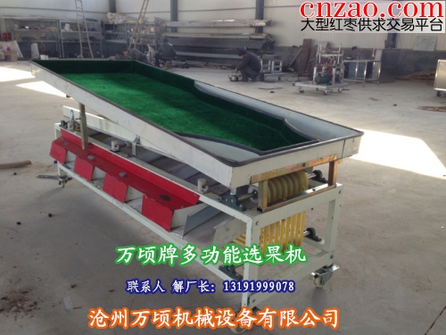 产品名称:万顷牌骏枣筛选机 生产厂家:河北沧州万顷设备机械有限公司 解厂长:13191999078 电话:0317-5810182 QQ:1390232985 设备特点: 万顷牌骏枣筛选机由机架、减速机、减速机罩壳、链轮罩壳、输送链、滚杠、出料斗、拉紧螺杆、拉紧挡板、主动轴、从动轴、从动链轮、主动链轮、减速机链轮等部件组成。原料进入该机后,在重力作用下,原料自行单层铺平于硅胶带表面,由于硅胶带之间留有间隙,使得硅胶带在传送的同时,物料即在不停旋转,并向出料方面移至下道工序,操作工即可在物料移动的过程中将不合格的果蔬检出,以保证果蔬的质量。本机也可根据用户的要求设计上输送坏果皮带输送机等方案。