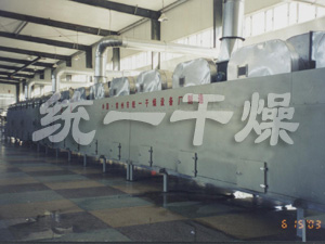 物料由加料器均匀地铺在网带上,网带采用12-60目不锈钢丝网。由传动装置拖动在干燥机内移动。干燥机由若干单元组成,每一单元热风独立循环,部分尾气由专门排湿风机排出,废气由调节阀控制,热气由下往上或由上往下穿过铺在网带上的物料,加热干燥并带走水分。网带缓慢移动,运行速度可根据物料温度自由调节,干燥后的成品连续落入收料器中。上下循环单元根据用户需要可灵活配备,单元数量可根据需要选取。