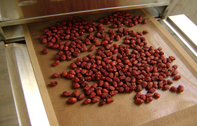 干燥干燥可采用自然干燥和人工干燥。自然干燥一般需一个月左右,并在晒制过程中每天翻动几次,以加速干燥过程,同时厚度不要太大,保证水分的快速蒸发。人工干燥一般每平方米烘盘装鲜枣15公斤左右,最后降温到时50℃,全部干燥需20-24小时。微波加热具有独特的加热方式- 物料整体加热,因此微波加热具有以下优点: 1、 穿透性加热,加热速度快,均匀加热。其穿透的距离,在理论上与电磁波波长同数量级。因此宏观上表现为加热速度快,均匀性好,物体色泽,成份保持不变。微波加热是使用使被加热物体本身成为发热物体,称之为整体加热方式,不需要热传导的过程,因此能在短时间内达到均匀加热。微波加热时物体各部位不论形状如何,通常都能均匀渗透电磁波,以产生热量,因此介质材料加热的无效性大大改善。微波加热与高频加热相比较不需在设计适合物形状的电极,所发不论何种开头的物体都能做到均匀加热,这一点对提高产品质量很有利。 2、 选择性加热,节能高效。微波对不同介质特性的物料有不同的作用,这一点对干燥加工特性很有利,因为水分子对微波的吸收效果最好,所以含水量最高的部位吸收微波功率最多,只对能吸收微波能的物体直接加热,对炉体、炉腔内空气几乎不加热,且微波加热时,被加热物料一般都是放在用金属制造的加热容器内,加热室对电波来说是个封闭的空腔,微波不能外泄,只能被加热物体吸收,加热室内的空气与相应的容器都不会发热,所以热效率极高,因此既高效、节能又改善工作环境。 3、 无热惯性,即具备即时性。因此能保证加工物料高品质。 4、 操作方便,宜于控制。微波加热可瞬间达到升降、开停的目的,热惯性极小,应用PLC加触摸控制屏,特别适宜于加热过程和加热工艺的规范和自动化控制。 5、 环保、清洁卫生。设备加热箱采用金属不锈钢制作,可采用水清洗,出料配有全密封料斗及粉尘回收装置,更无“三废”产生。 6、 安全无害。微波能是在金属制造的封闭加热容器和波导管中工作,能量的泄漏极小;我公司的微波设备采用先进的设计、精良的加工,使进出料口、观察窗、炉门等处的微波泄漏大大优于国家标准。因微波没有放射线危害及有害气体的排放,所以这是一种十分安全的加热干燥设备